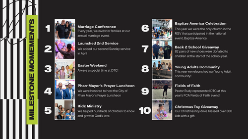 We are filled with gratitude as we reflect on the significant impact we made in our community in 2025. We were blessed to welcome numerous new families and help many people take the next step in their faith journey. This year, we were honored to host the City of Pharr Mayor's Prayer Luncheon, an annual event where city, state, and community leaders unite for the National Day of Prayer. We added our second Sunday service, gathered for worship at many events throughout the year, and deepened our relationships with God and one another.